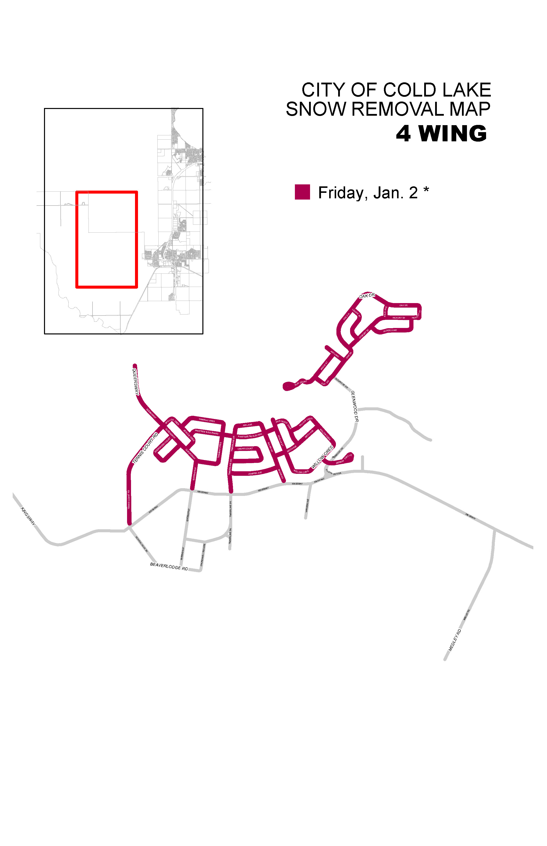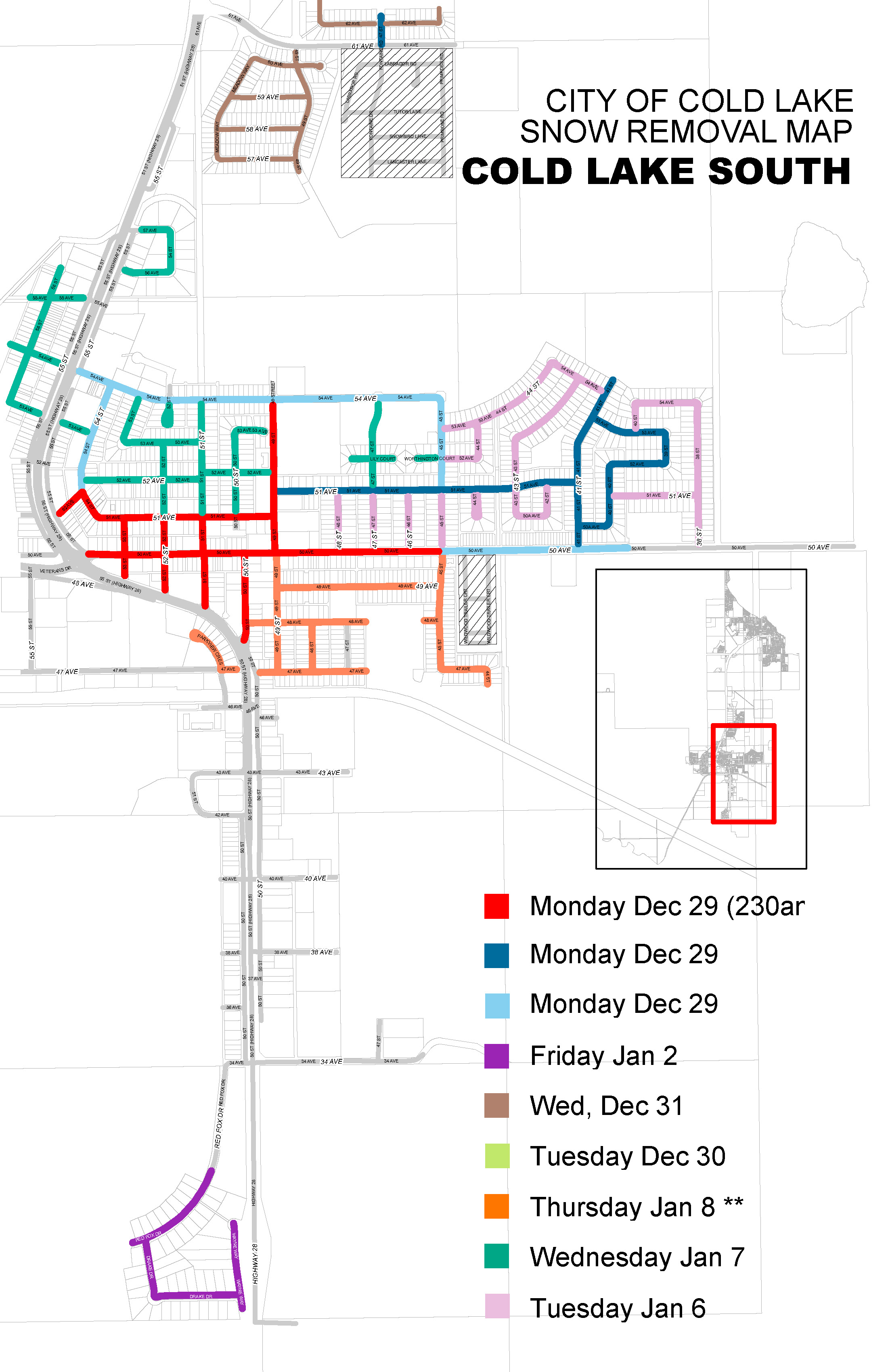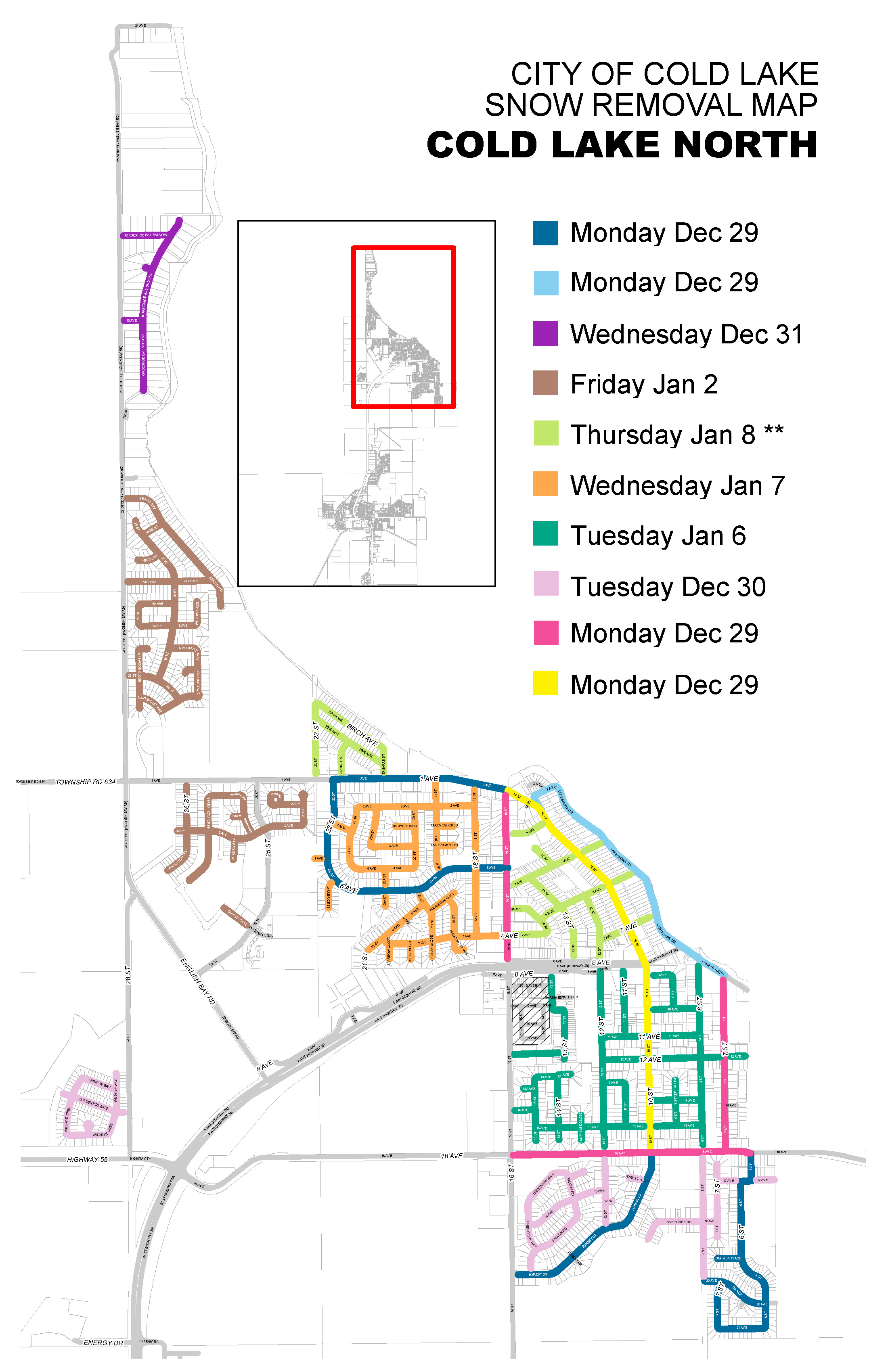 Please do not park on the street on your neighbourhood's assigned snow removal day. Signs are placed at neighbourhood entrances at least 24 hours before snow removal crews arrive. Under the City of Cold Lake's Vehicle and Pedestrian Traffic Bylaw #536-PL-14, vehicles left parked on the street after 24 hours notice has been given, may be ticketed and/or towed at the owner's expense.