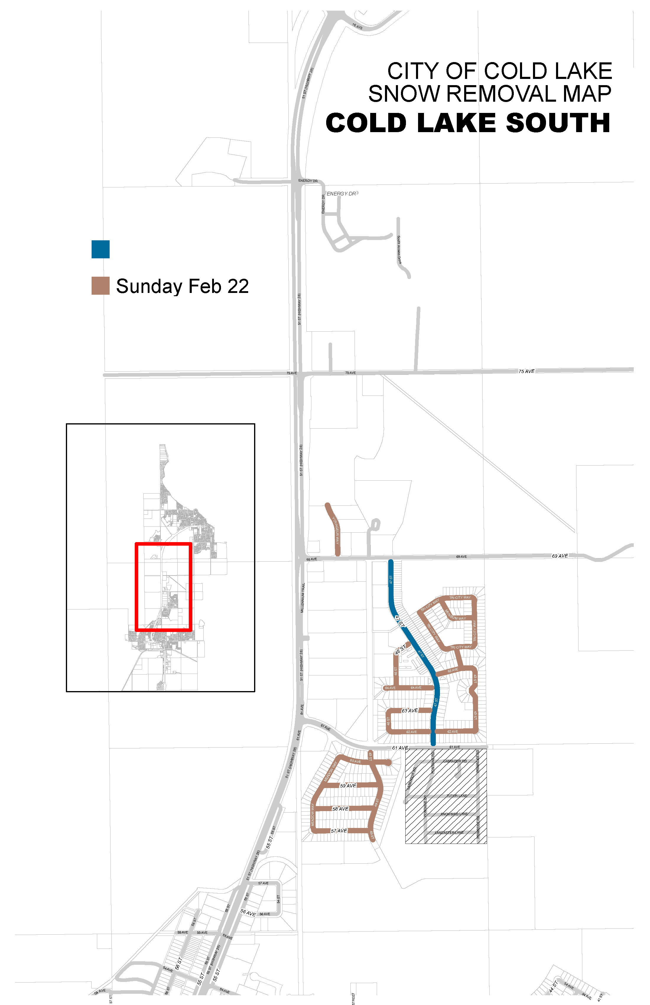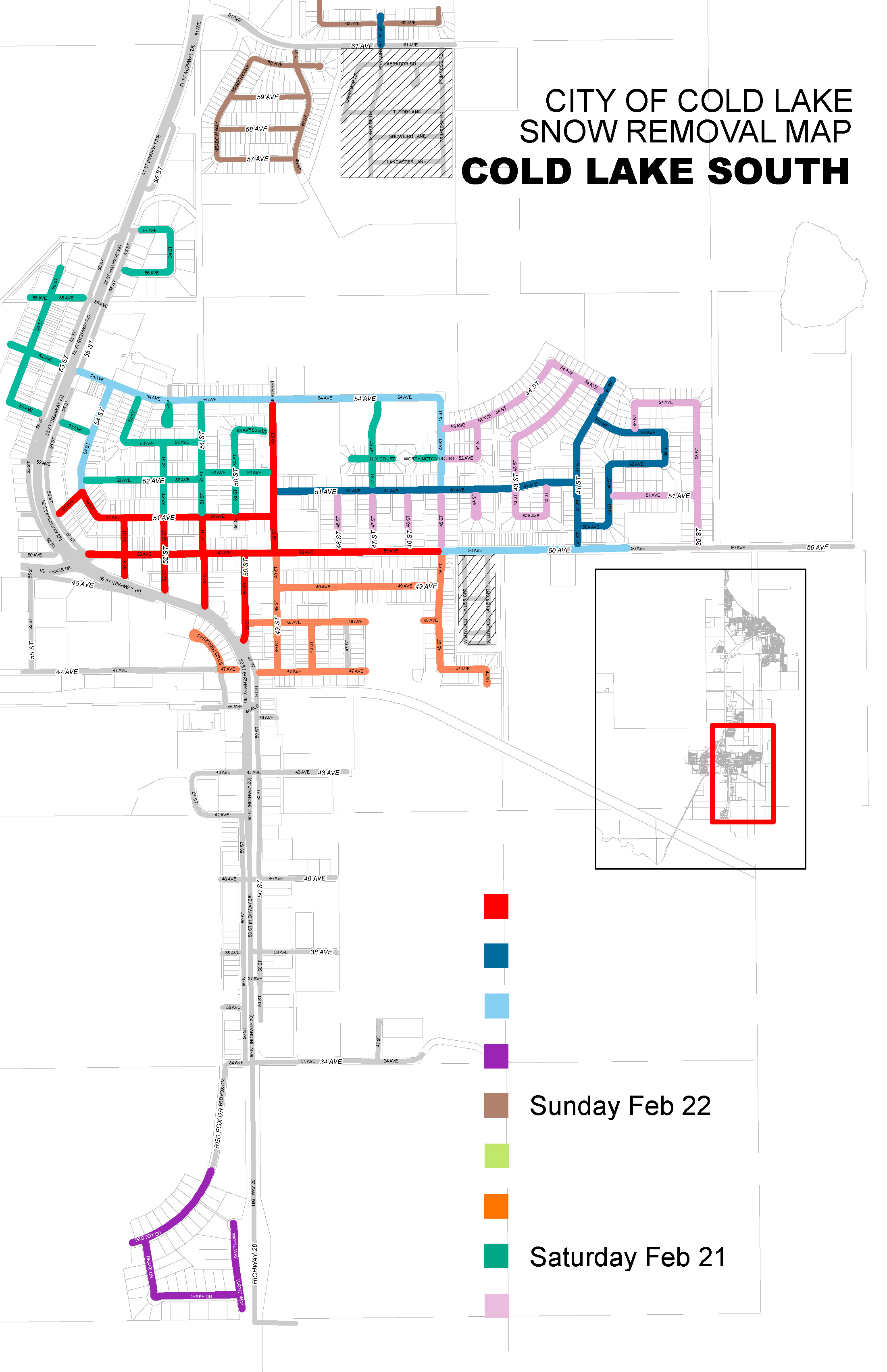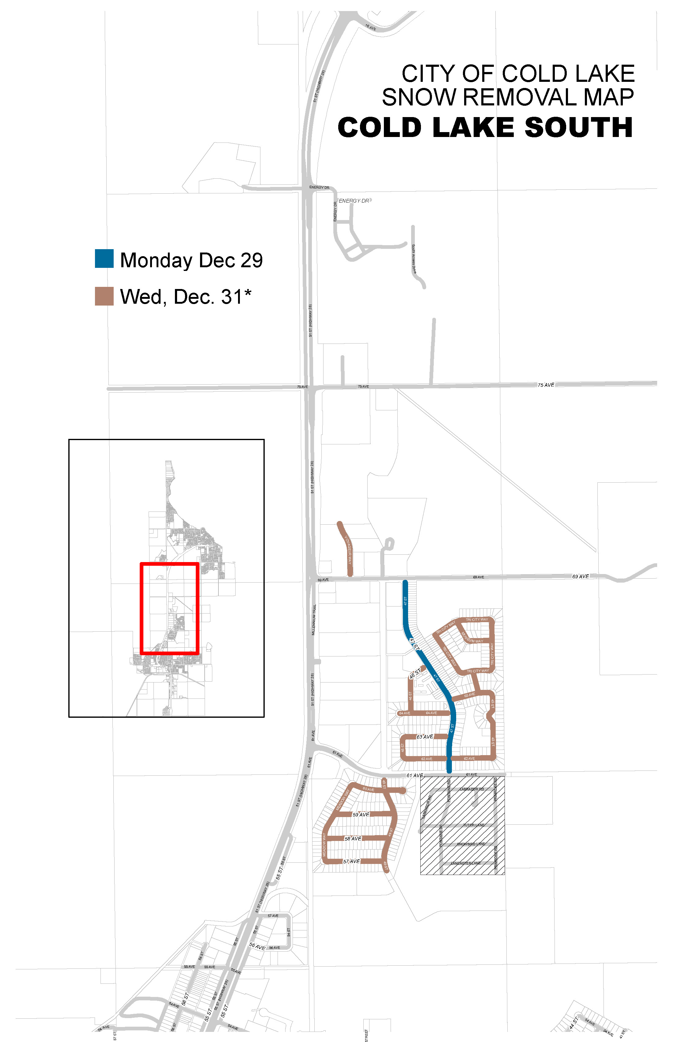 Please do not park on the street on your neighbourhood's assigned snow removal day. Signs are placed at neighbourhood entrances at least 24 hours before snow removal crews arrive. Under the City of Cold Lake's Vehicle and Pedestrian Traffic Bylaw #536-PL-14, vehicles left parked on the street after 24 hours notice has been given, may be ticketed and/or towed at the owner's expense.