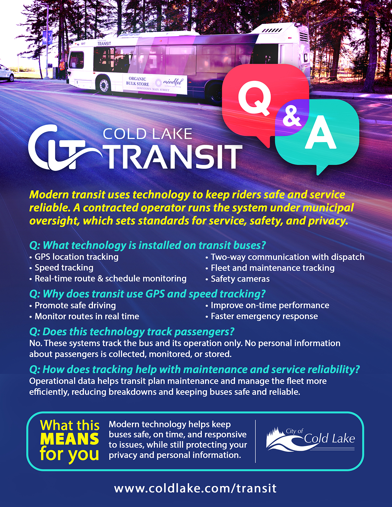 The City of Cold Lake takes advantage of several forms of technology to ensure riders are safe and our transit system runs effectively and efficiently. From tracking, communications and security, all of these components work together to to make the Cold Lake Transit what it is today.