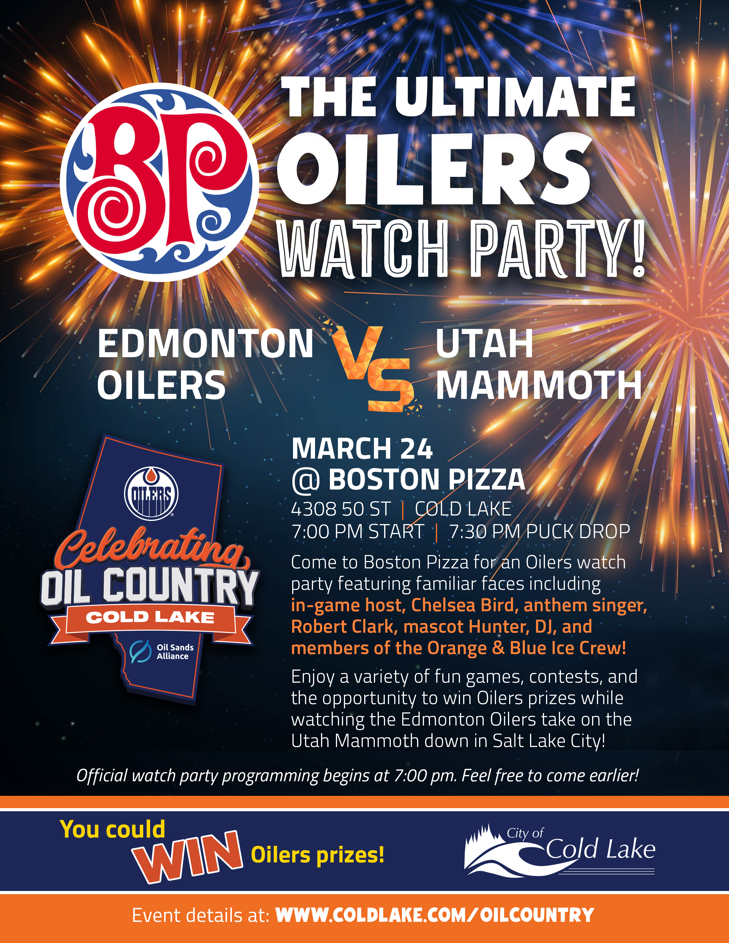 Celebrating Oil Country in Cold Lake will be capping things off with an awesome watch party, hosted by our local Boston Pizza. Come out for great food and a great game as the Edmonton Oilers will be taking on the Utah Mammoth. Hunter will be onsite to keep the party going and special guests Chelsea Bird and anthem singer Robert Clarke will also be in the house.